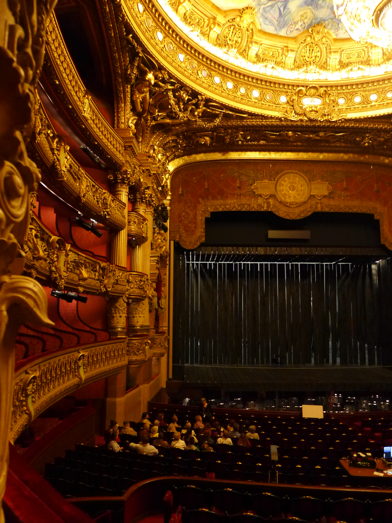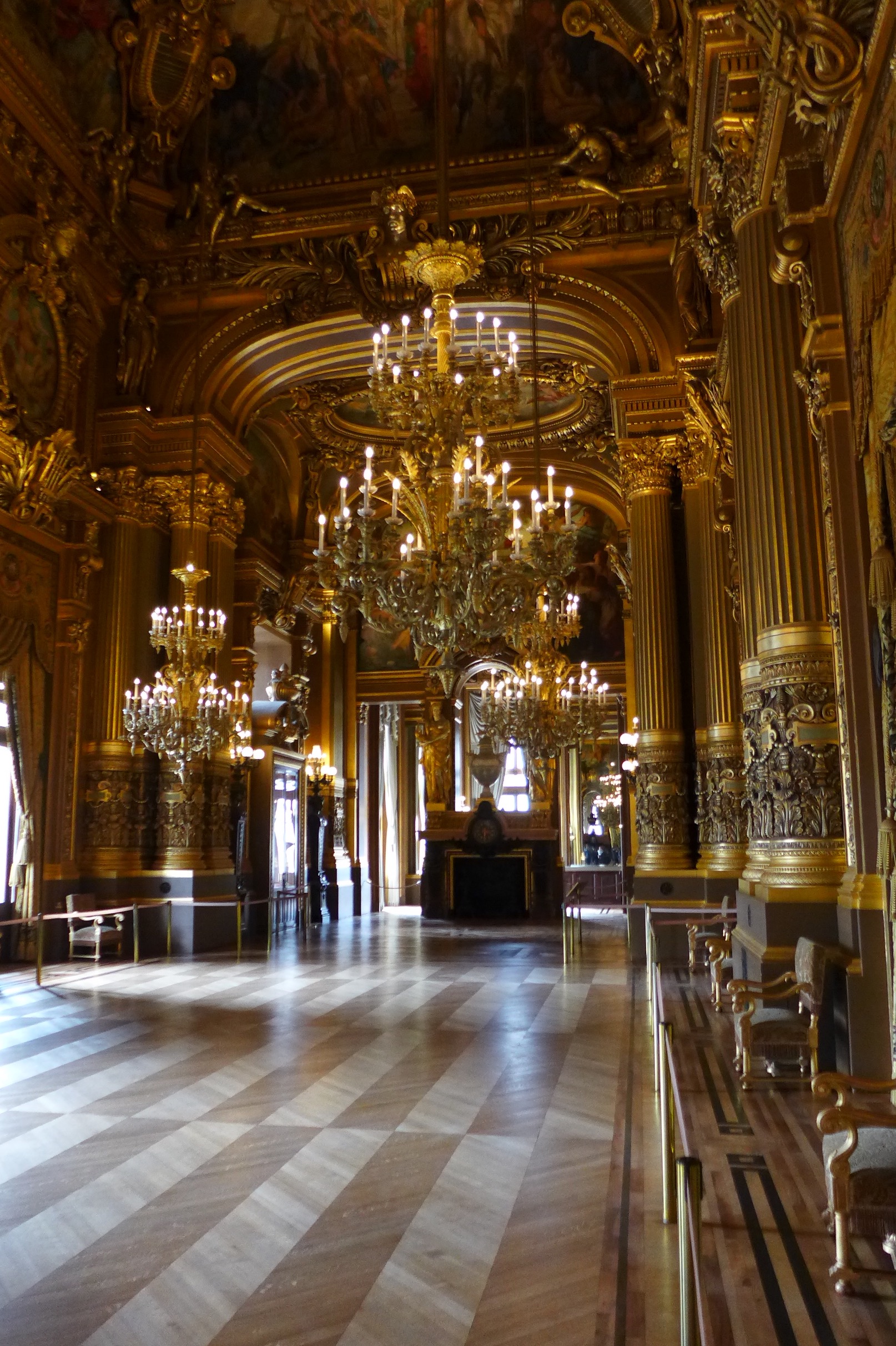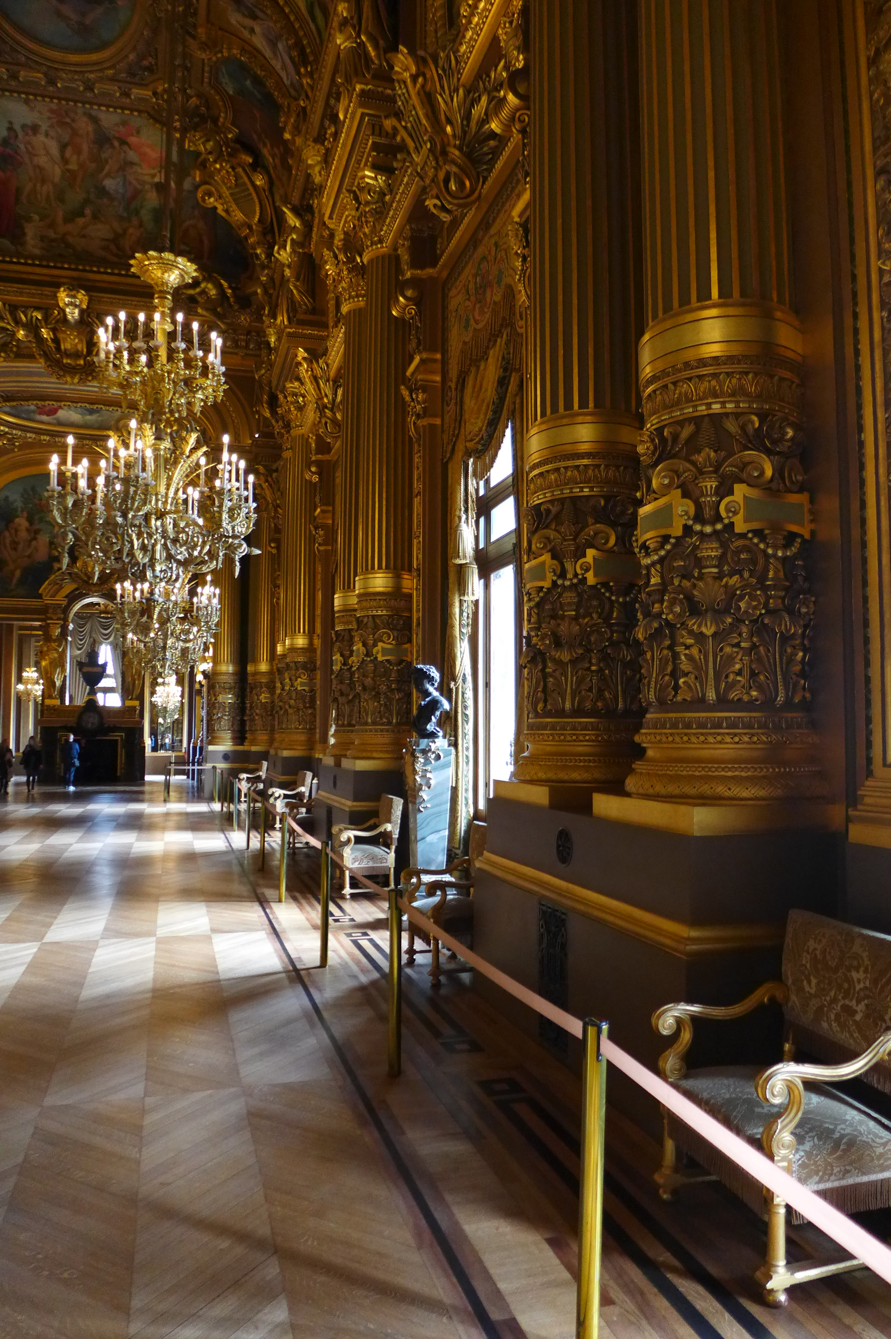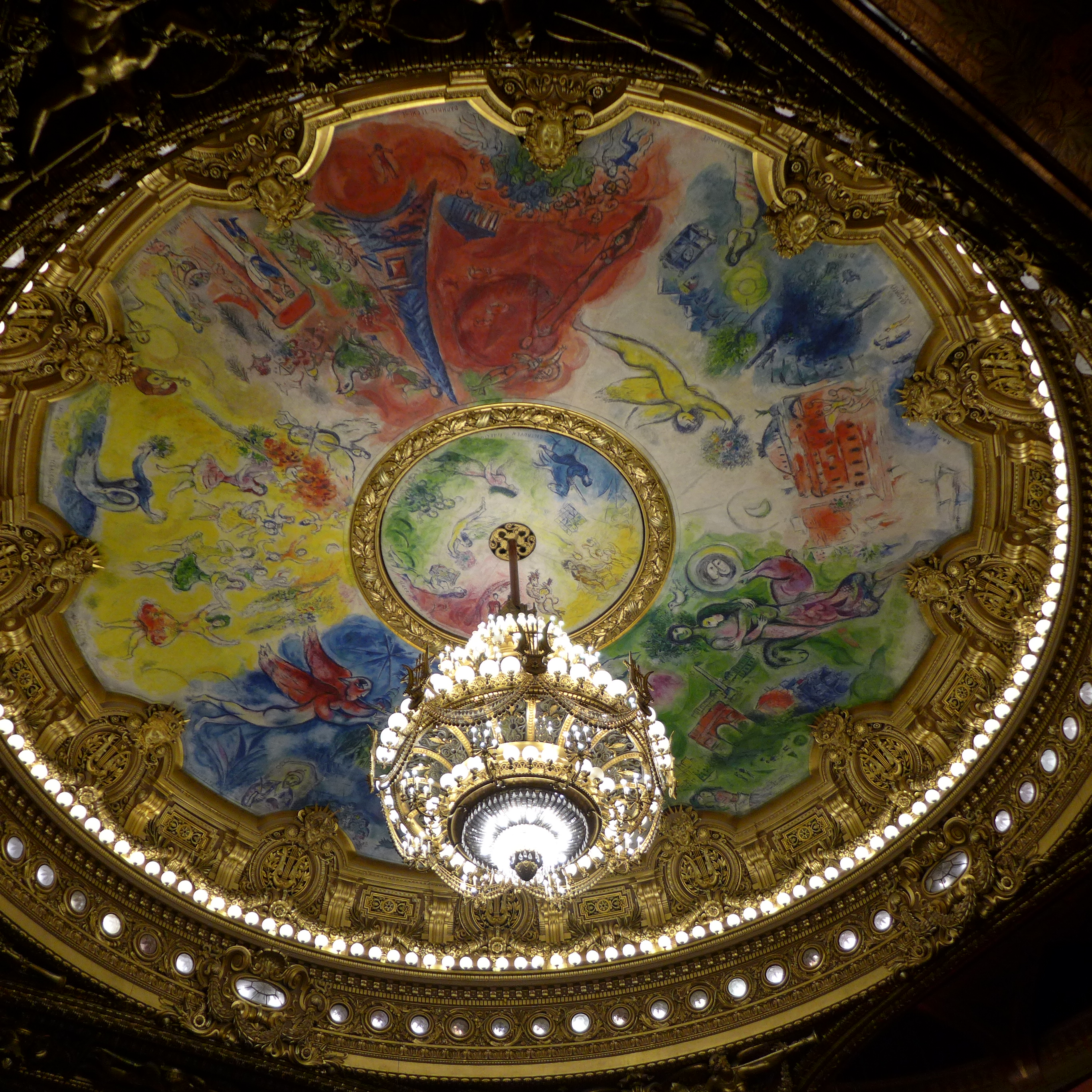 After lunch, we visited the Palaise Garnier (Paris Opera House) which was just across the street. Made infamous as the location of the story from the 1910 novel Phantom of the Opera, we did a self guided audio tour which was the best choice for us. After seeing the tours being lead by guides–in English or French–I would suggest doing the self guided tour. It’s easy and you can spend more time at your leisure in the awe inspiring theater. Stories of life in the mid 1800’s that are told on the audio guide set the stage for an experience of what it must have been like attending an opera, ballet or other theatrical performance in a venue laden with gold gilding and reflective mirrors which provide the patrons an opportunity to see and be seen. Experiencing a piece of high society living from that time can still be experienced today as productions are still going on today. Unfortunately, it was between productions so we couldn’t experience a live performance but that leaves something to do in the future. One amazing “new” feature of the Opera House is the painted ceiling by Marc Chagall. In 1965, Marc Chagall was commissioned to paint a new ceiling (onto a removable canvas much to my relief) in the Auditorium. It depicts fourteen major composers who were popular composers of the 1800’s. Many purists criticize the work while others praise it. You decide for yourself. In the photos, you will find the original artwork and an image of the Chagall piece.