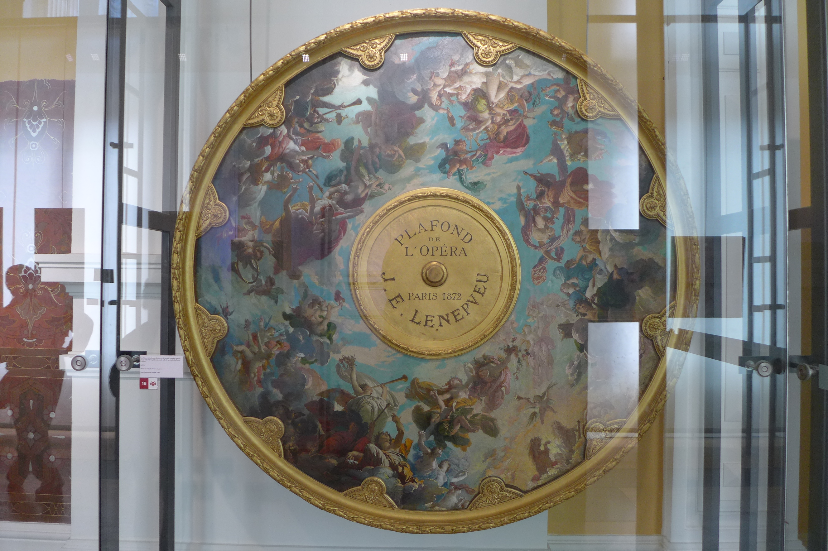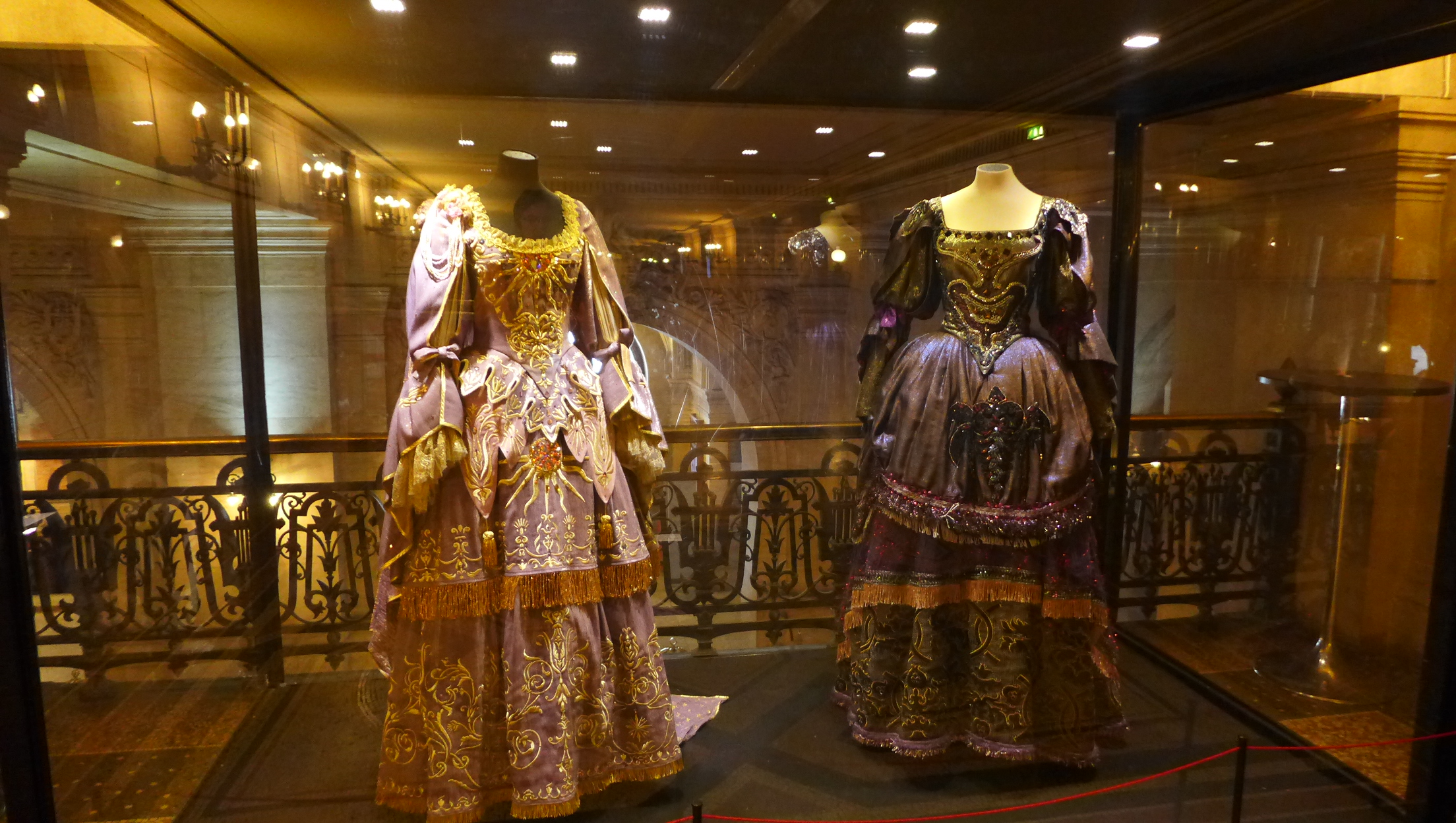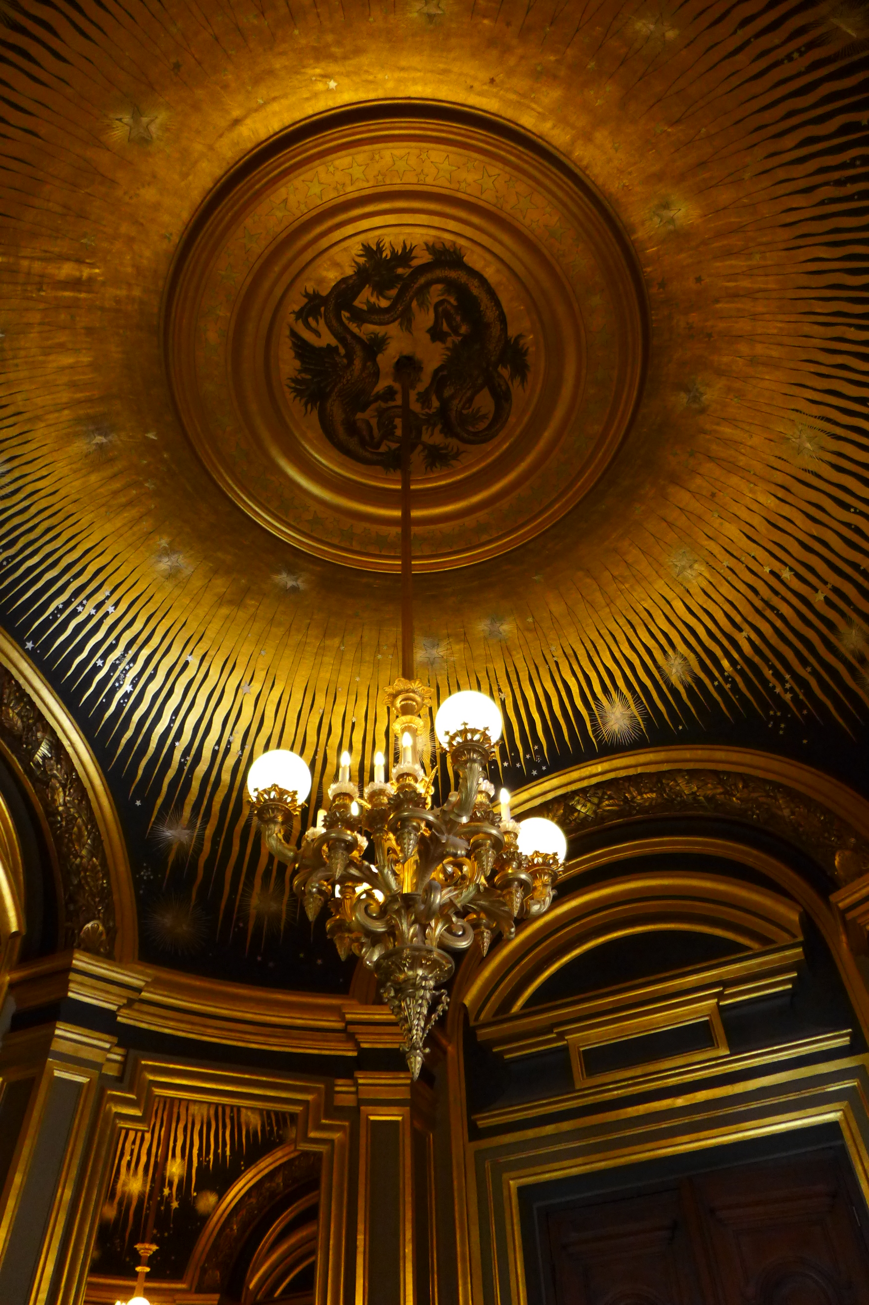 After lunch, we visited the Palaise Garnier (Paris Opera House) which was just across the street. Made infamous as the location of the story from the 1910 novel Phantom of the Opera, we did a self guided audio tour which was the best choice for us. After seeing the tours being lead by guides–in English or French–I would suggest doing the self guided tour. It’s easy and you can spend more time at your leisure in the awe inspiring theater. Stories of life in the mid 1800’s that are told on the audio guide set the stage for an experience of what it must have been like attending an opera, ballet or other theatrical performance in a venue laden with gold gilding and reflective mirrors which provide the patrons an opportunity to see and be seen. Experiencing a piece of high society living from that time can still be experienced today as productions are still going on today. Unfortunately, it was between productions so we couldn’t experience a live performance but that leaves something to do in the future. One amazing “new” feature of the Opera House is the painted ceiling by Marc Chagall. In 1965, Marc Chagall was commissioned to paint a new ceiling (onto a removable canvas much to my relief) in the Auditorium. It depicts fourteen major composers who were popular composers of the 1800’s. Many purists criticize the work while others praise it. You decide for yourself. In the photos, you will find the original artwork and an image of the Chagall piece.