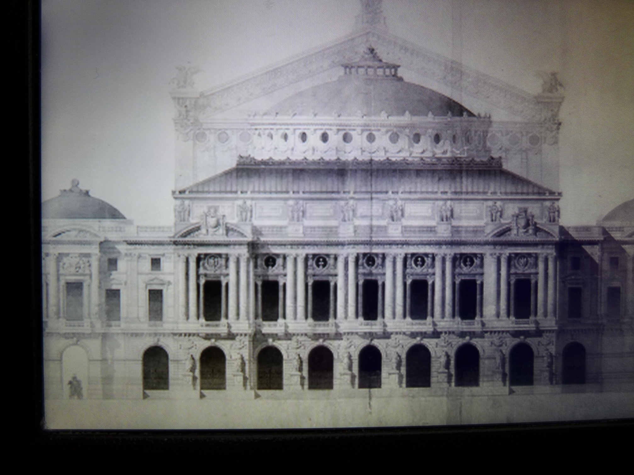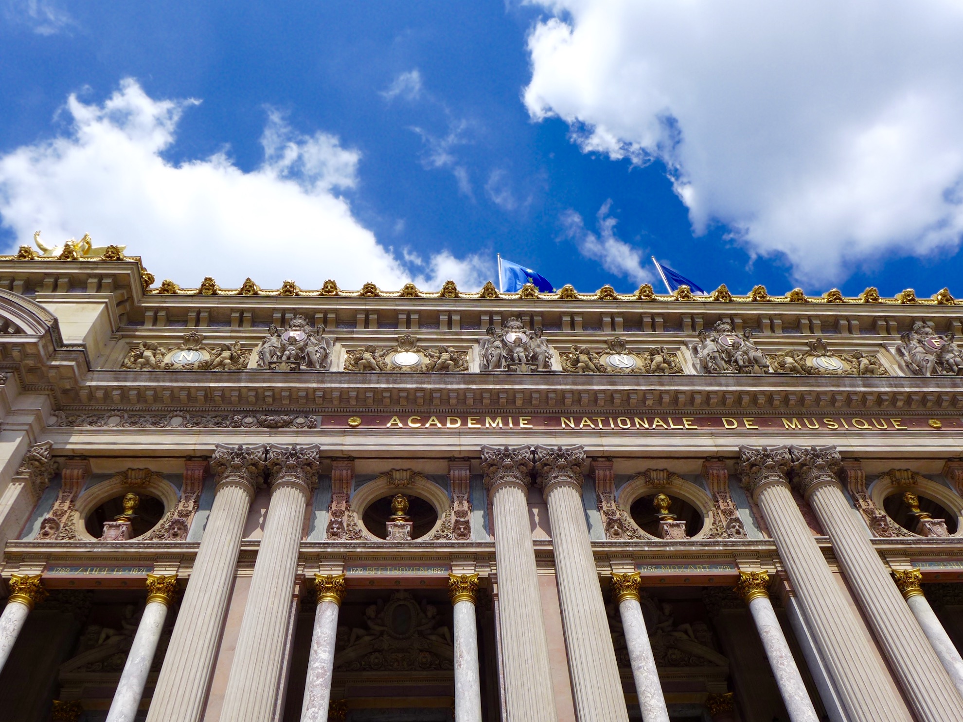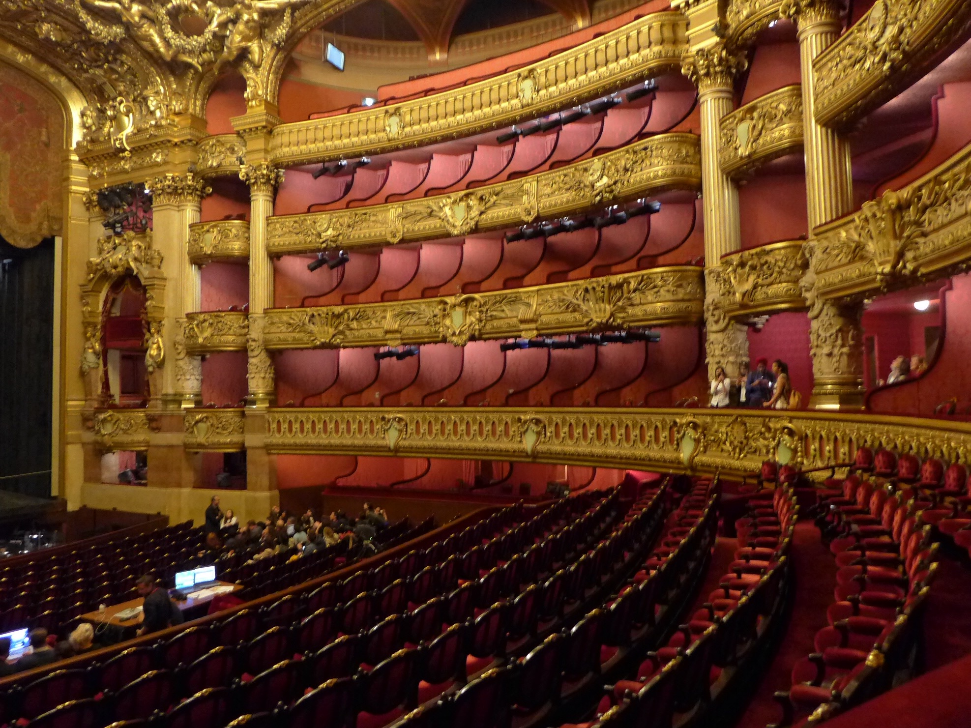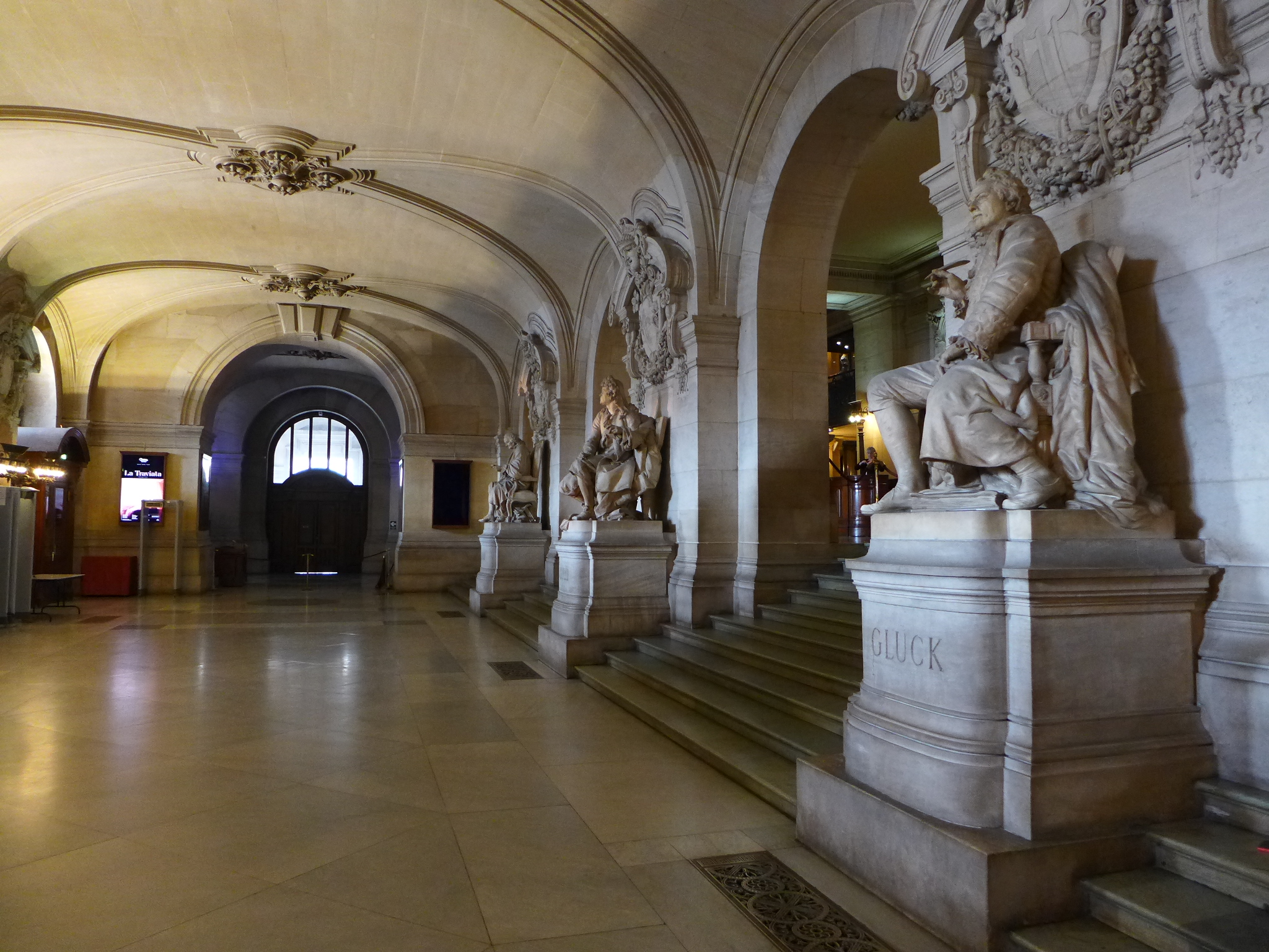 After lunch, we visited the Palaise Garnier (Paris Opera House) which was just across the street. Made infamous as the location of the story from the 1910 novel Phantom of the Opera, we did a self guided audio tour which was the best choice for us. After seeing the tours being lead by guides–in English or French–I would suggest doing the self guided tour. It’s easy and you can spend more time at your leisure in the awe inspiring theater. Stories of life in the mid 1800’s that are told on the audio guide set the stage for an experience of what it must have been like attending an opera, ballet or other theatrical performance in a venue laden with gold gilding and reflective mirrors which provide the patrons an opportunity to see and be seen. Experiencing a piece of high society living from that time can still be experienced today as productions are still going on today. Unfortunately, it was between productions so we couldn’t experience a live performance but that leaves something to do in the future. One amazing “new” feature of the Opera House is the painted ceiling by Marc Chagall. In 1965, Marc Chagall was commissioned to paint a new ceiling (onto a removable canvas much to my relief) in the Auditorium. It depicts fourteen major composers who were popular composers of the 1800’s. Many purists criticize the work while others praise it. You decide for yourself. In the photos, you will find the original artwork and an image of the Chagall piece.