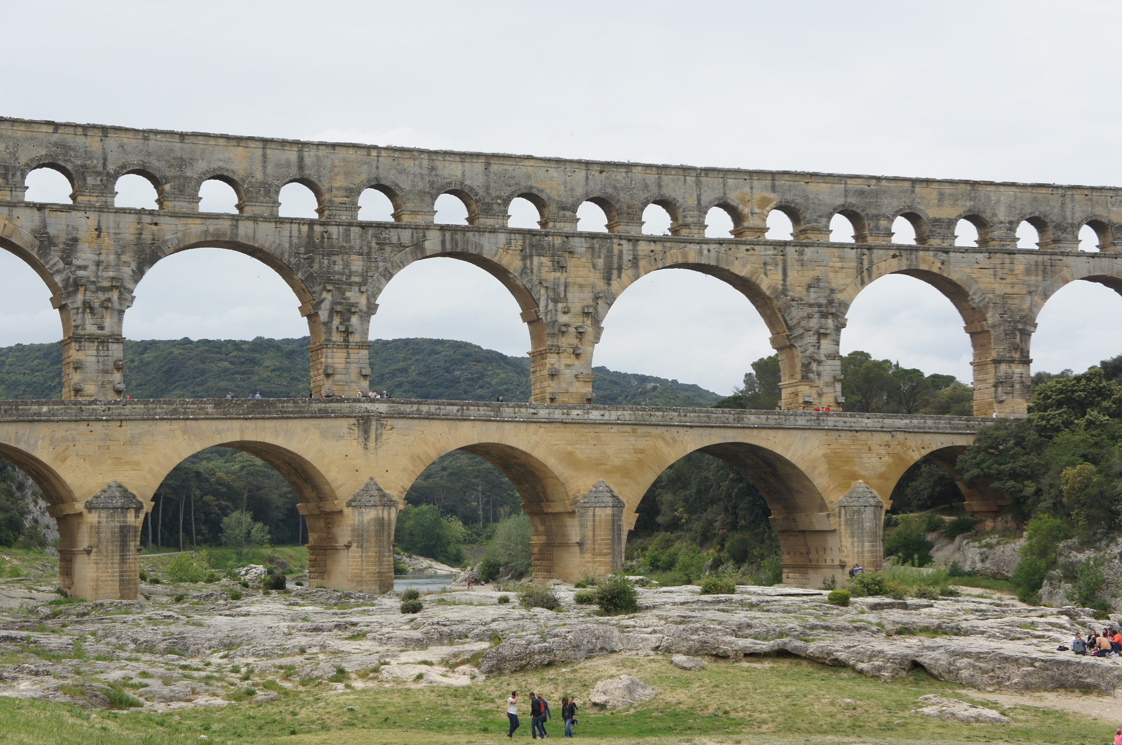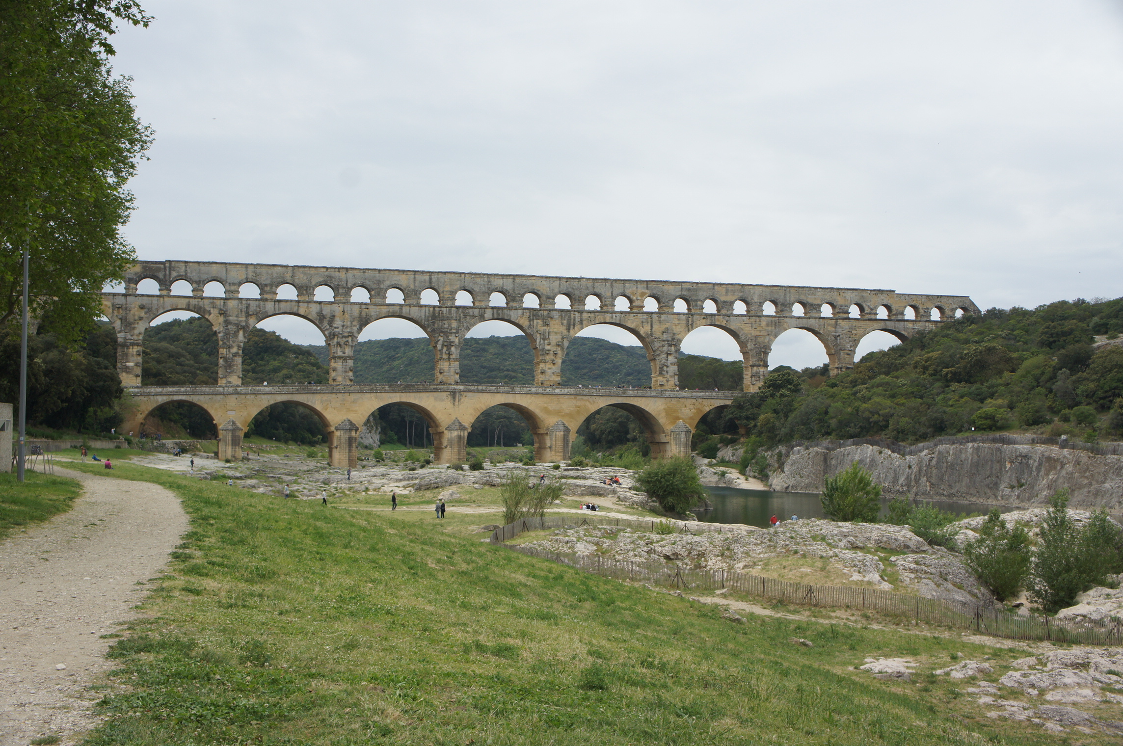 The day started with a full breakfast prepared in our villa as it was Mother’s Day and we are in St. Remy de Provence…how’s that for a reason?  On the agenda was a walk around  town then we headed out to the visit the Pont du Gard. The Pont du Gard is an ancient Roman Aquaduct that was constructed starting in 50 AD to carry water from a source high up in the hills to a town called Nimes supply large amounts of water needed for its baths, fountains and gardens.  It spans the river Gardon  on three levels for a distance of nearly 500 meters. Constructed of stone quarried from a local source–some weighing 6 tons–the structure has stood for centuries in spite of being subjected to pilfering of stone materials taken for use on other local building projects over the last few hundred years.  The aquaduct is a beautiful reminder of the technical ingenuity and determination that existed almost 2000 years ago.  If you have an opportunity to visit Pont du Gard, you should go. While you’re there, you can take several different hikes on trails that lead through the wooded area that probably hasn’t changed much in character since the aqueduct was built.  Of particular interest,  there is a 1000 year old olive tree that was transplanted into the park.  It’s pretty amazing, too.